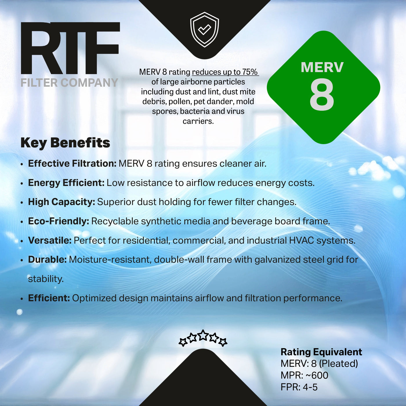 MERV 8 rating reduces up to 75% of large airborne particles including dust and lint, dust mite debris, pollen, pet dander, mold spores, bacteria and virus carriers.