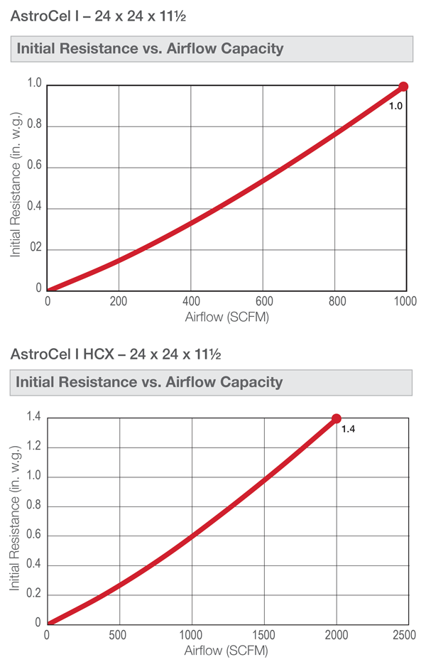 The pleat openings and exits of the Astrocel I filter deliver low entrance and exit losses. This, combined with less restriction from separator material and better media utilization, delivers a low pressure drop. The high capacity (HCX) model utilizes tapered separators, which allow a doubling of airflow with only a 40% increase in resistance. The lower operating resistance reduces operating costs and saves energy.